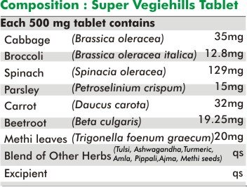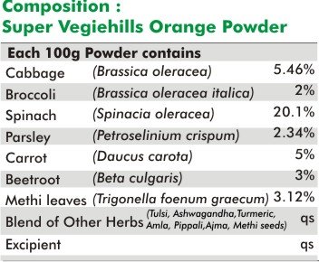 01.Super Vegiehills contains ingredients such as Cabbage, Brocolli, Spinach, Parsley, Carrot, Beetroot, Methi leaves etc.