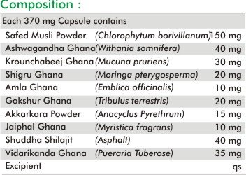 Main Ingredients :Ashwagandha, Safed Musli, Krounchabeej, Shilajit
